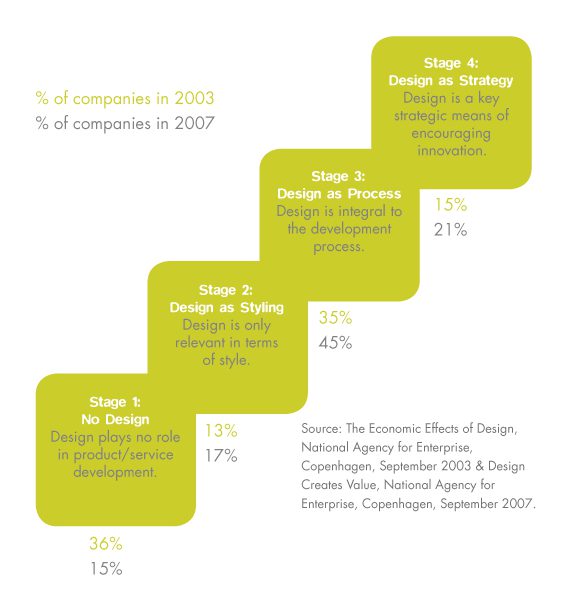 This was originally published in Ambidextrous magazine’s ‘Nearly Winter 2006’ issue, in an essay entitled Investing in design: To build business buy-in, designers need to buy in to business, by Rosa Wu and Jess McCullin. I like it for many reasons, and in fact the shift from style to problem solving / framing echoes some of what is coming out of DMI-influenced organizations in Europe in the past few years. Interestingly, many of the more recent models put the least mature state on the bottom, but that’s not the case here. Although I was thrilled to find it at the time, I am not sure these dimensions would be easy to use in an executive conversation.